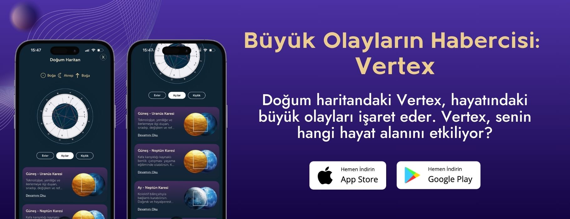 - Büyük Gezegen Açıları: Satürn, Uranüs, Neptün veya Plüton’un Vertex ile yaptığı açılar kalıcı dönüşümlerin başlangıcını simgeler.